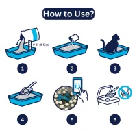 Pour 10 to 12 cm of litter into an empty, dry tray. Spread the bag of Blücare® granules evenly over the litter. Remove urine and feces clumps daily with a litter scoop. Wait 3 minutes after urine has come into contact with the granules, then observe the result.