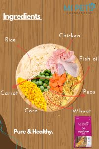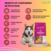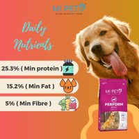 MI PETS PERFORM ADULT DOGFOOD is complete and balanced nutrition for all breeds with fresh chicken and rice as major ingredients . Adult dog require complete and balanced nutrition that meets their requirements to maintain their good health and condition . It is formulated with the best quality ingredients and supplemented with fish oil ( rich in DHA and Omega – 3 Fatty acid ) and lecithin ( rich in Choline ) to help enhance brain and nervous system function and promote heart health . The product is formulated and designed by our veterinarians and nutritionist . Who are having more than 36 years of experience in pet food product development in USA and European countries . The product is especially designed to meet the standards of Association of American feed control officials ( AAFCO ).