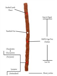 Rawhide free treats. With lycopen, glucosamine and chondroitin. Easyto digest. Low fat. 100% cage free chicken. Made in Thailand.