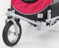 Convert the TRIXIE Dog Trailer into a versatile, all-terrain jogger or stroller with the TRIXIE Dog Bike Trailer Stroller Conversion Kit. If you switch between cycling, walking, and jogging, then the Trixie dog bike conversion kit is right for you. You can park your bike and hit the trails on foot, and your buddy will enjoy the same comfortable ride in his familiar bike stroller. Please pay attention to the maximum load capacity of the bicycle basket. Acquaint the dog with the basket before your first trip and allow sufficient time for this. If necessary, practice riding the bike with the basket but without your pet beforehand, placing a comparable weight in the basket to get used to the changed steering behaviour. Hold your bike firmly while putting your pet into the basket or taking it out. Use a harness to attach and secure your pet to the short leash in the basket. When you use a bicycle stand, there is the danger that your bike could fall over with your pet. Do not leave your pet unattended in the basket.